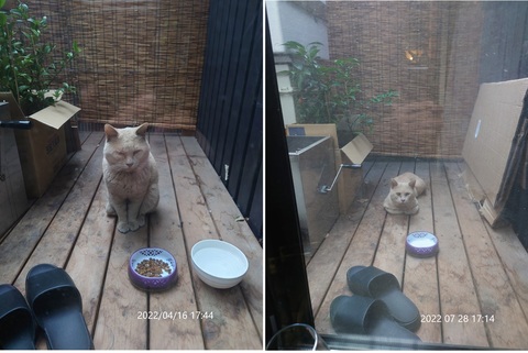 この方々との出会い方も不思議でしたが、この後に起こる猫の怪奇現象で私は明主様のご苦難を確信しました。向かって左側2022年4月16日の写真は3月の異能者カミサマのお店の勝手口に現れたのら猫。この状態で15分以上身動きせず、この写真を3月の異能者のお姉様にLINEで送り観てもらうと猫の後ろに男性二人が見えるとのこと。私はこの猫は目が悪いのかと思いましたが、この時だけで3か月後の向かって右7月の写真をみてもわかるように普通な目をしています。